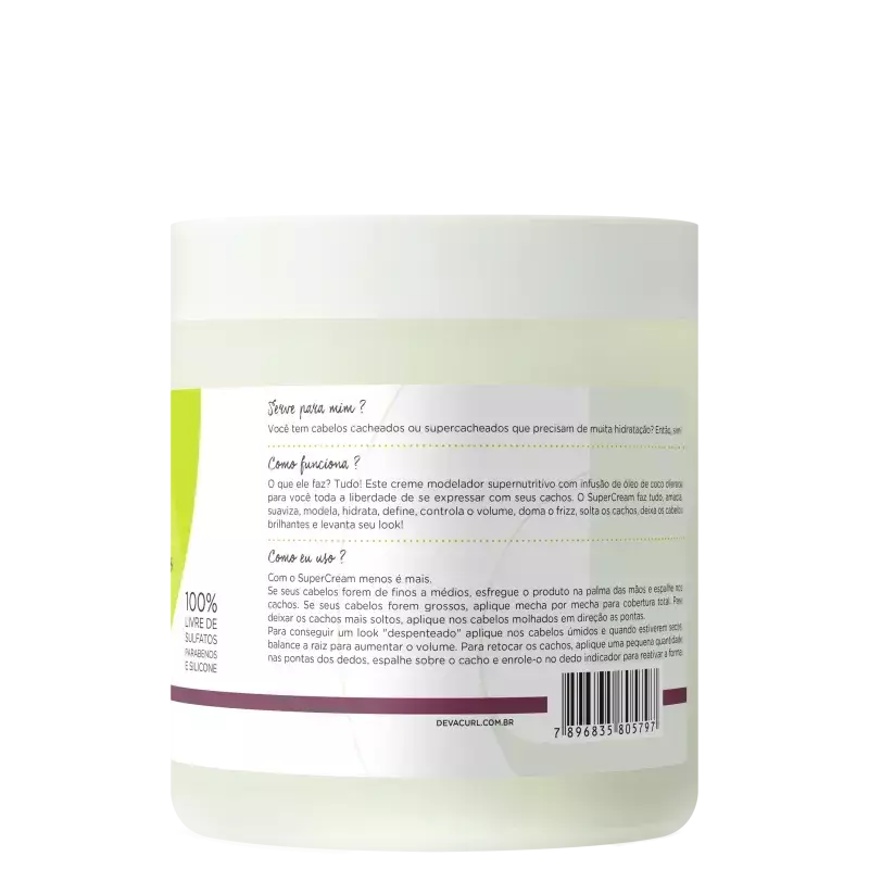 O Ativador de Cachos Deva Curl Supercream possui em sua fórmula o óleo de coco, rico em ativos que conservam a hidratação por mais tempo na fibra capilar deixando-a macia e emoliente. Além disso, protege os cachos contra os fatores externos causadores de ressecamento. É liberado para no e low poo por não conter sulfato, parabenos e silicones.